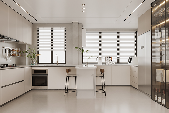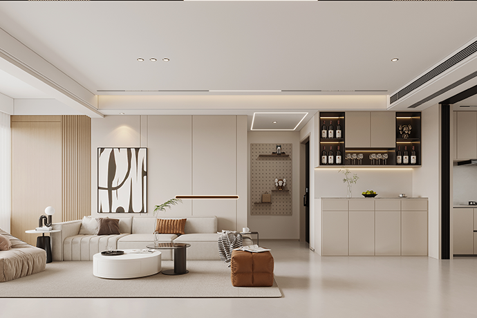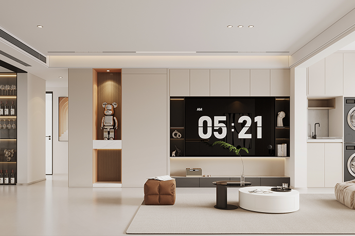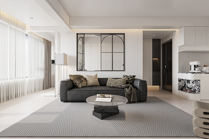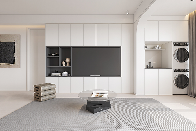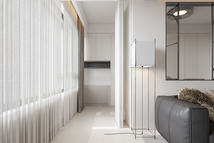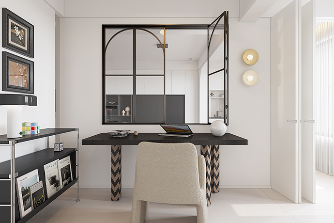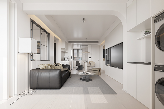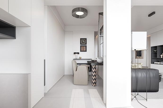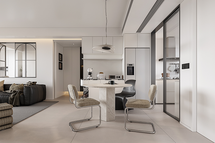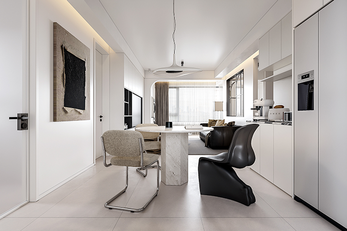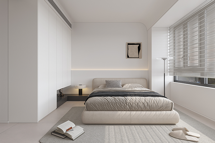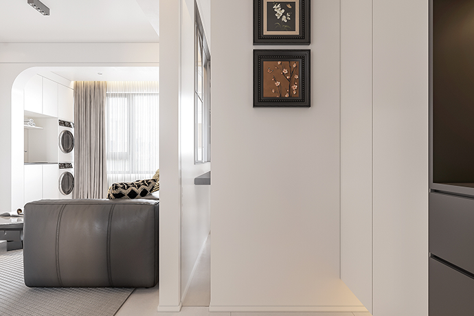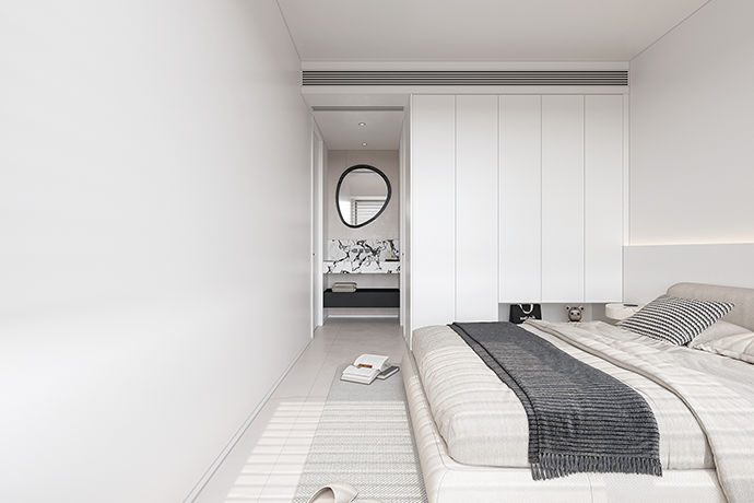 阳台并入客厅,并与相连的书房打通,形成双动线布局。保留双卫布局,并做干湿分离,迎合居住者的个性化生活需求。主卧室扩容,提高睡眠环境的舒适度。